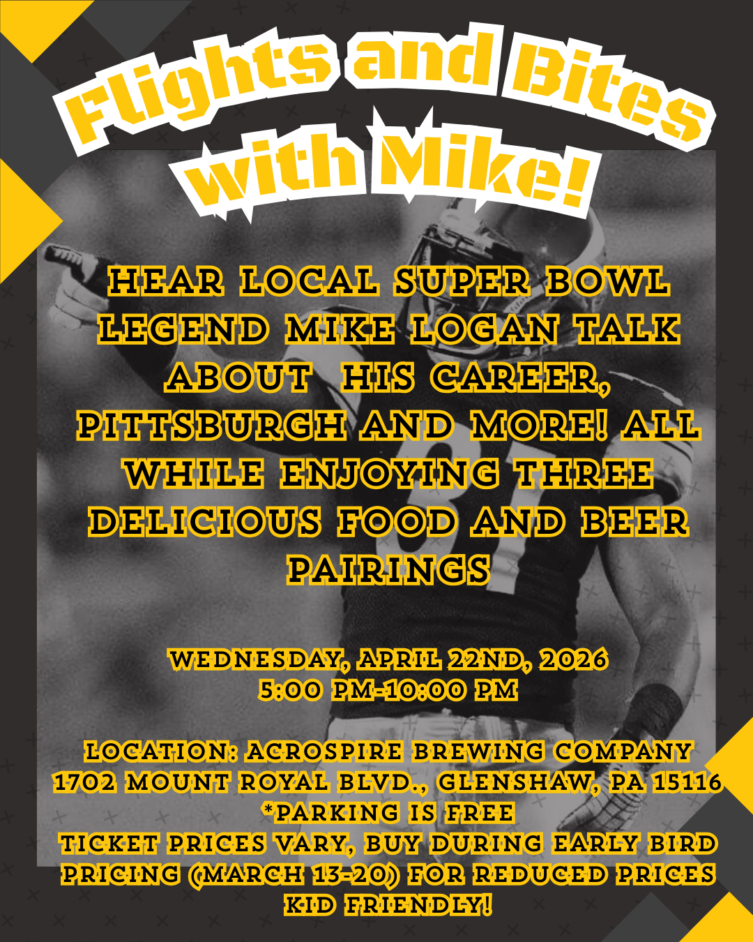 Hear local Super Bowl legend, Mike Logan, talk about his rise to the highest levels of football. The night will include food and beer pairings as well as photo opportunities! Bring your friends and family!