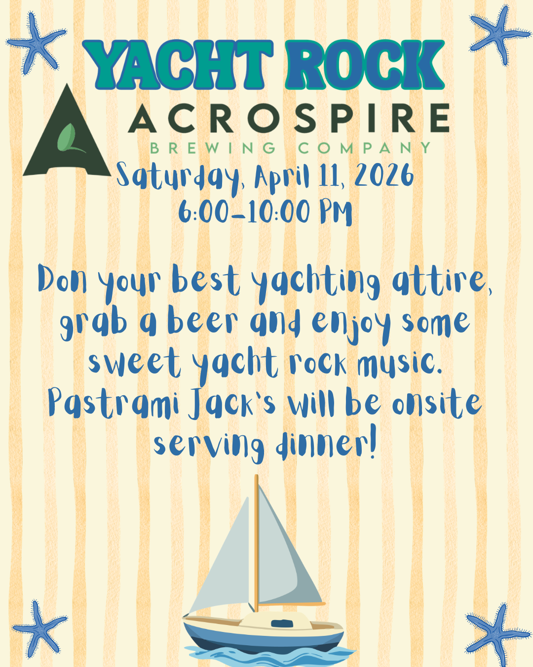 Yacht Rock Night! Saturday, April 11, 2026 6:00 PM 10:00 PM 18:00 22:00 Acrospire Brewing Company 1702 Mt Royal Blvd Glenshaw, PA, 15116 United States (map) Google Calendar ICS Don your best yachting attire and come jam to yacht rock all night with us!